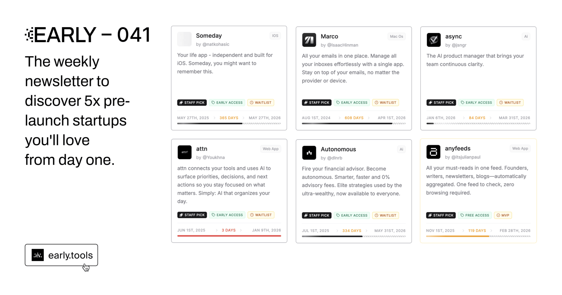 Welcome to the 41st edition of the weekly early.tools newsletter sent to over 2000+ readers with launch updates and 5x of the latest notable pre-launch startups every Monday. I am Julian Paul, and I will do my best to update you as tools move through Waitlist → MVP → Launched phases, so you don’t miss a thing in the early startup lifecycle of products that will (most likely) matter.
