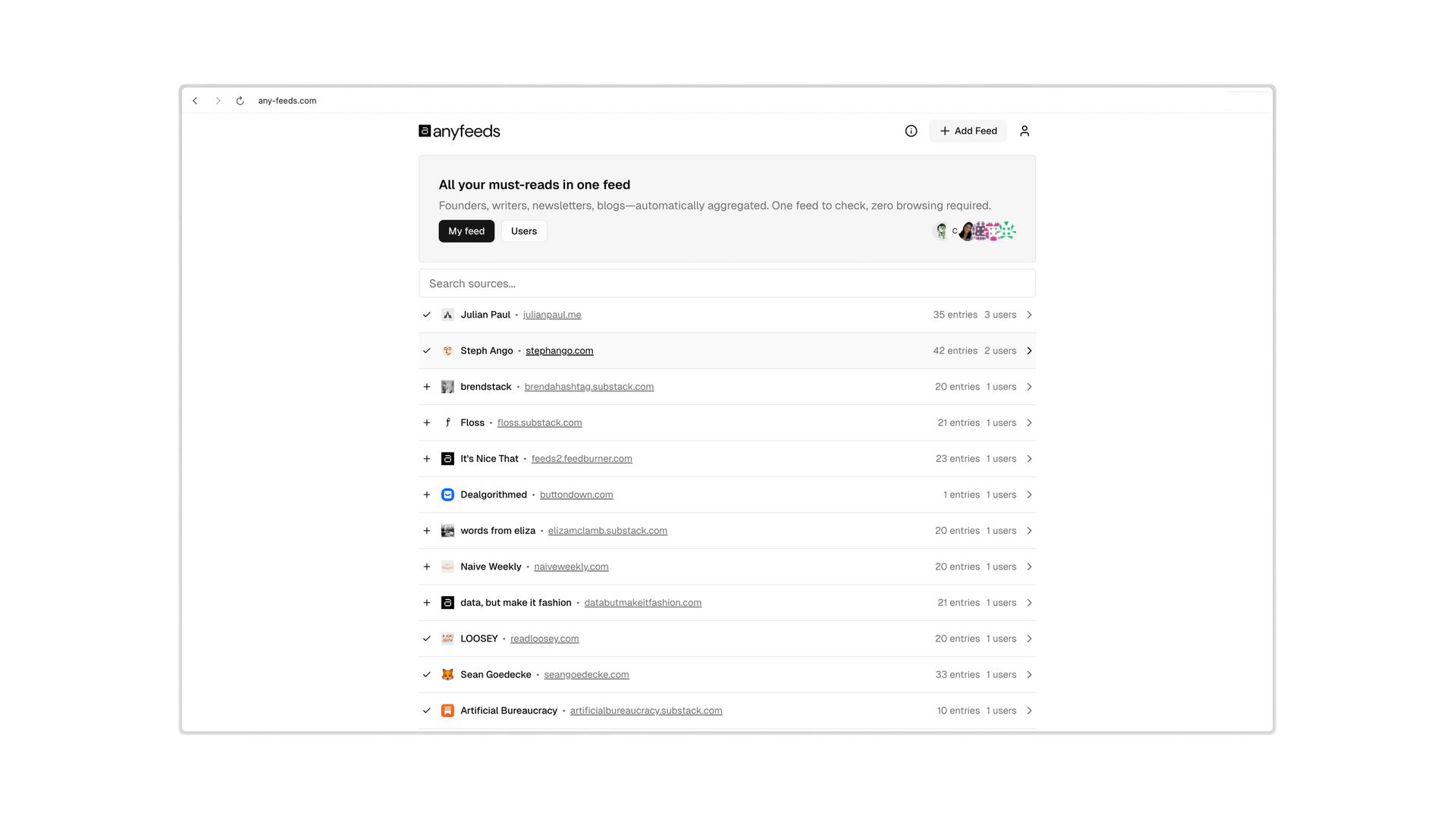 anyfeeds → all your must-reads in one feed. Founders, writers, newsletters, blogs—automatically aggregated. One feed to check, zero browsing required.