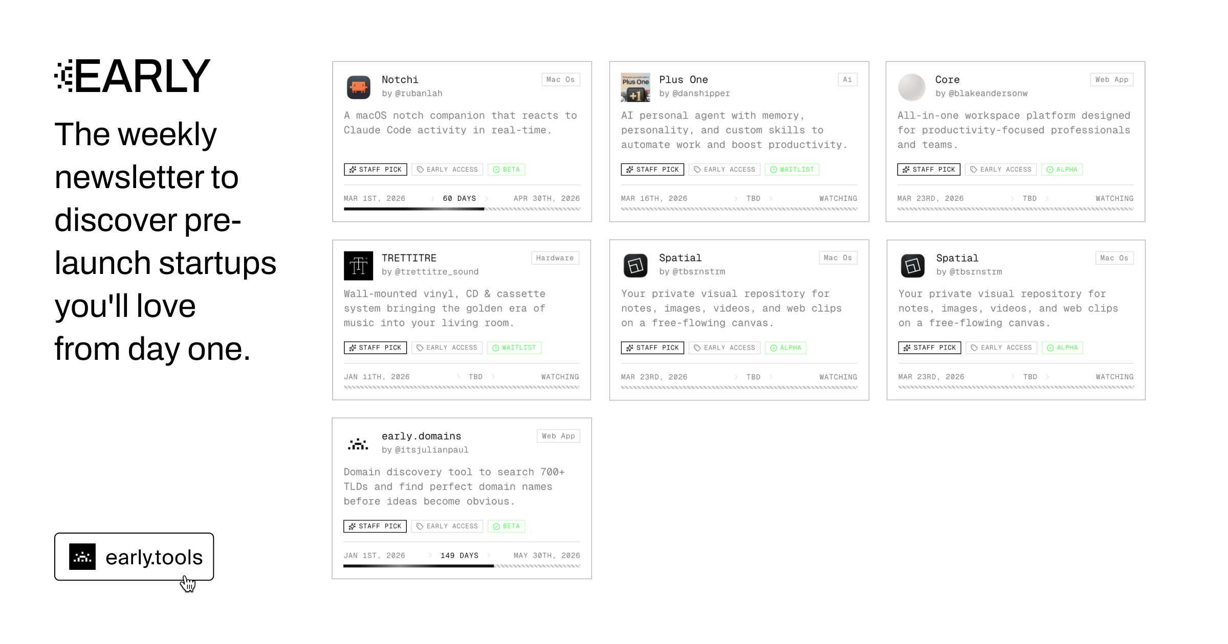 Discover 2x waitlists: PlusOne & TRETTITRE: Retro Back to the Future, alongside 4x Early Products: early.domains, Spatial, Core & Notchi.